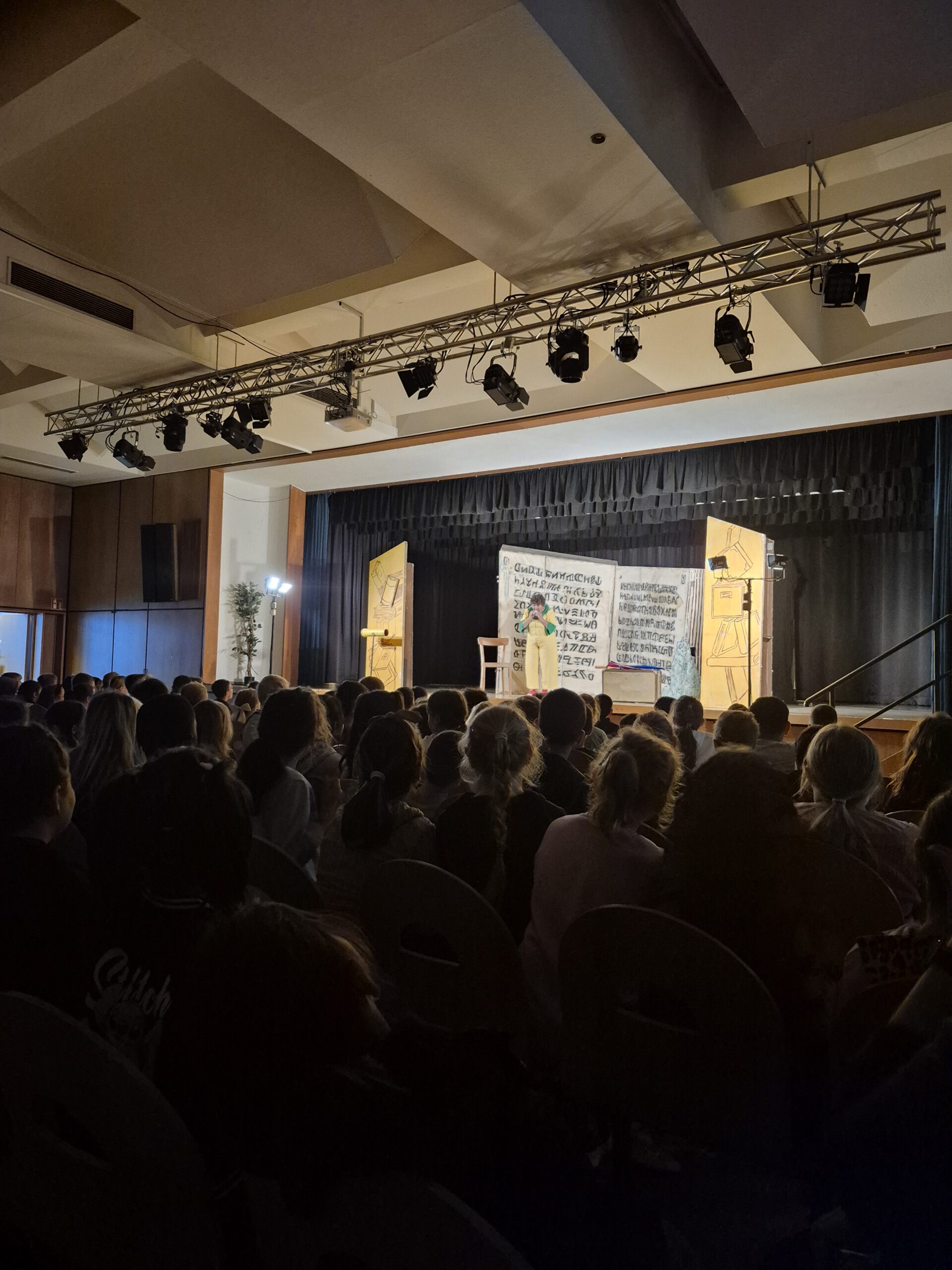 Am Dienstag war das Theaterstück „Der Bücherwurm“ bei uns zu Gast. In dem Stück zieht ein Bücherwurm in ein Buch ein, das voller Abenteuer steckt.
