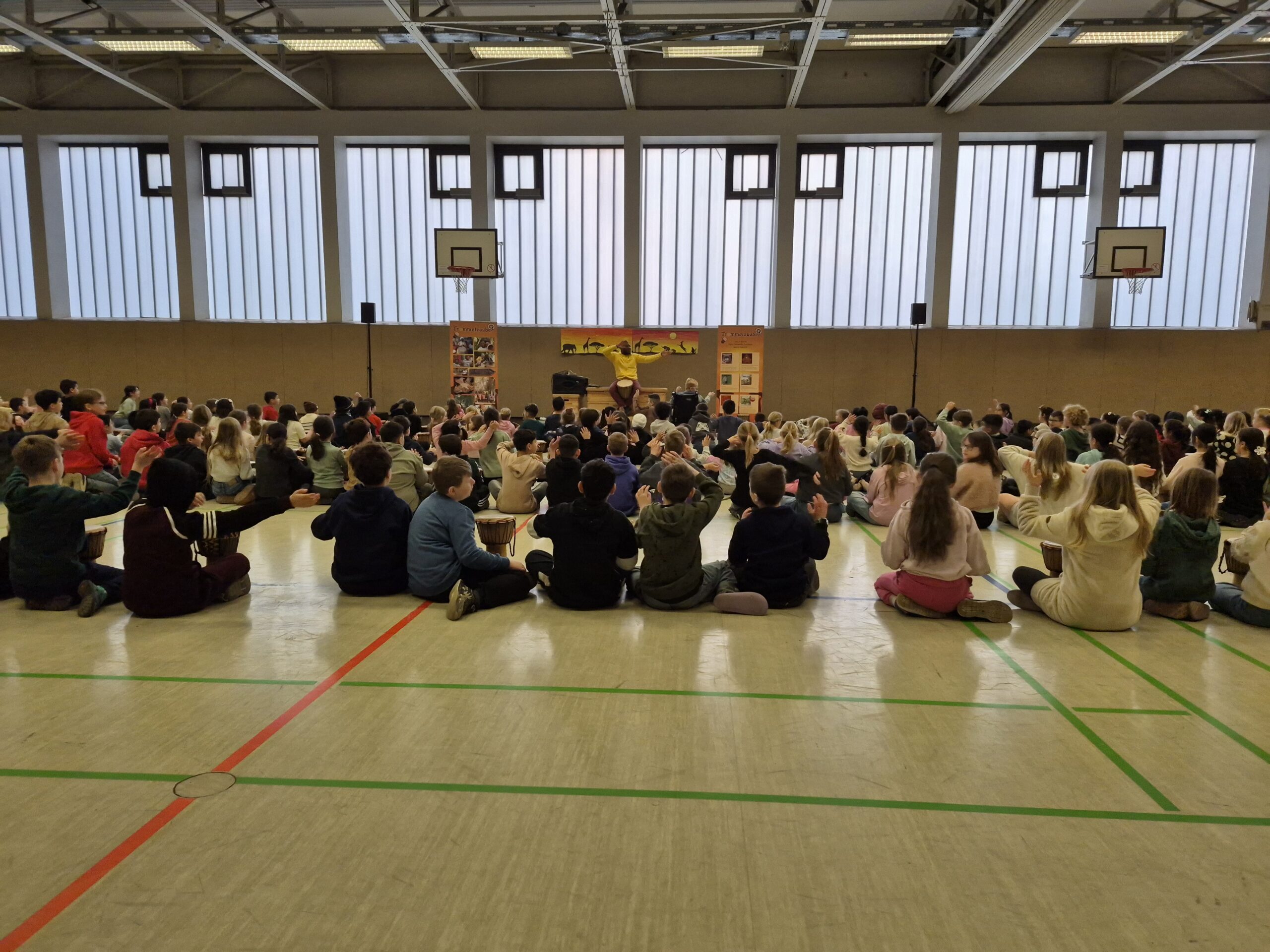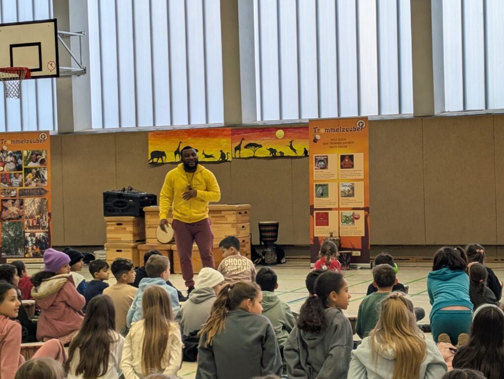 Bei der Abschlussaufführung führten die Kinder mit den erlernten Trommelrhytmen und Liedern durch verschiedene Abenteuer, die sie auf dem Weg in das Dorf Tamborena erleben.