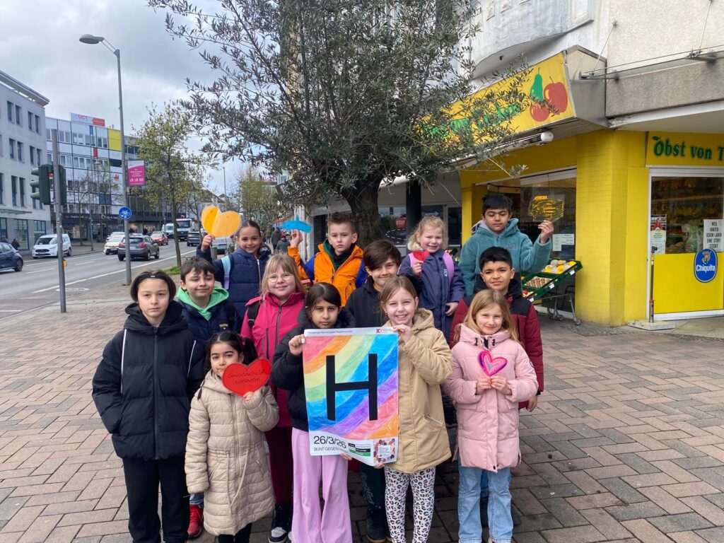 Im Rahmen des Netzwerks „Schule ohne Rassismus – Schule mit Courage“ haben einige unserer Kinder stellvertretend für unsere Schule an dem No-Hate-Walk teilgenommen. Der Spaziergang setzt ein Zeichen für Respekt und Zusammenhalt. Das Motto lautete „Bunt gegen Hass“.